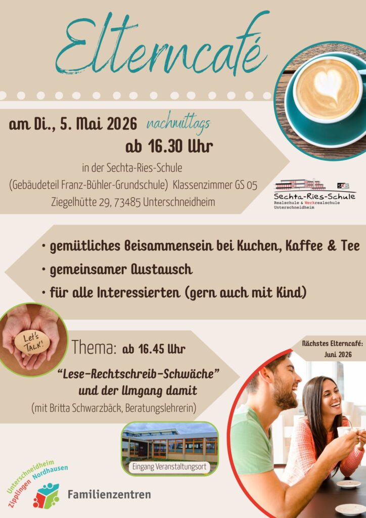 Die Sechta-Ries-Schule lädt in Kooperation mit dem Familienzentrum herzlich zum Elterncafé ein. Im Rahmen eines kurzen Vortrags informiert die Beratungslehrerin Britta Schwarzbäck, zuständig auch für die Grundschulen in Zipplingen, Zöbingen und Unterschneidheim, über den Umgang mit dem Thema „Lese-Rechtschreib-Schwäche“. Dabei geht sie näher auf die Diagnostik, die schulische Förderung sowie verschiedene Unterstützungsmöglichkeiten ein. (Eine Kinderbetreuung wird im Klassenzimmer nebenan angeboten)